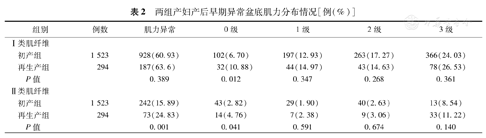 两组产妇产后早期异常盆底肌力分布情况[例(%)]