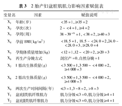 | Y2 | 盆底Ⅱ类肌纤维肌力 | 肌力分级≤3=0,肌力分级≥4=1 |