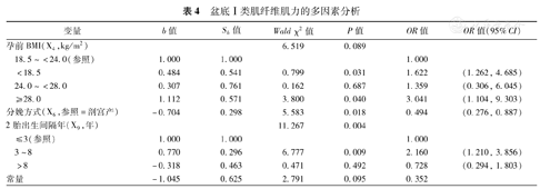 ±s进行描述,计数资料以百分比(%)或率表示;影响盆底肌力异常的相关因素的分析采用Z检验和非条件logistic回归分析。以盆底肌力作为因变量,筛选变量的标准为α入=0.05,α出=0.10,采用向后的Wald检验进行变量筛选。单因素分析,以P<0.05为差异有统计学意义。