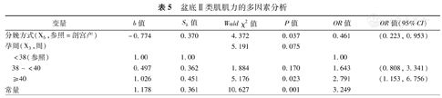 本研究对盆底肌Ⅰ类和Ⅱ类肌纤维分别进行了单因素和多因素分析。通过查阅文献并结合临床研究,将可能影响再生产妇盆底肌肌力的相关因素进行变量赋值,包括再生产年龄、2次生育时间间隔年、孕次、再生产分娩孕周、再生产妇孕前BMI、再生产妇孕期体质量增加、再生产分娩方式、1胎和2胎新生儿体质量9大类变量,具体的影响因素赋值情况如表3所示。P<0.05提示差异有统计学意义。(1)再生产妇女盆底肌力的单因素分析:单因素分析结果显示,再生产妇孕前BMI(P=0.038)、再生产分娩方式(P=0.005)和两次生产时间间隔年(P=0.001)与再生产妇盆底Ⅰ类肌纤维肌力异常显著相关。再生产分娩方式(P= 0.033)和孕周(P= 0.029)与再生产妇女盆底肌Ⅱ类肌纤维肌力异常显著相关。(2)再生产妇女盆底肌力的多因素分析:多因素分析结果显示:同再生产时间间隔3~8年相比,≤3年的再生产妇产后早期盆底Ⅰ类肌纤维肌力受损风险显著增加(OR=2.16,95%CI1.21~3.86);同BMI18.5~24.0 kg/m2相比,孕前BMI<18.5 kg/m2和≥28.0 kg/m2的再生产妇女产后早期盆底Ⅰ类肌纤维损伤的风险显著增高(OR=1.62,95%CI 1.26~4.69,OR=3.04,95%CI 1.10~9.30)(表4);与分娩孕周<38周相比,分娩孕周≥ 40周的再生产妇女产后早期盆底Ⅱ类肌纤维肌力损伤风险显著升高(OR=2.79,95%CI 1.156~6.76)(表5);阴道分娩的再生产妇女与剖宫产相比,产后早期盆底Ⅰ&Ⅱ肌纤维受损风险均显著增加(Ⅰ类OR=0.46,95%CI 0.22~0.95,Ⅱ类OR=0.49,95%CI 0.28 ~ 0.89),见表4,表5。