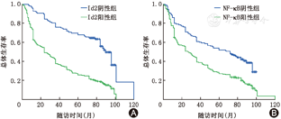 Id2和NF-κB/P65阳性表达组患者的术后总体生存时间短于阴性表达组(HR=3.082, 95%CI 2.235~4.250,P<0.001;HR=1.894, 95%CI 1.457~2.461,P<0.001)(图3)。
