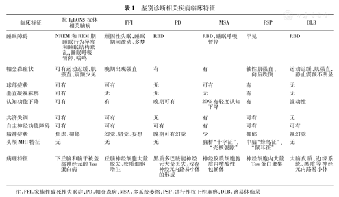 注:FFI:家族性致死性失眠症;PD:帕金森病;MSA:多系统萎缩;PSP:进行性核上性麻痹;DLB:路易体痴呆