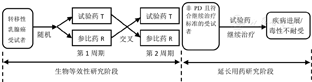 利用生物等效性研究采用随机、两周期、自身交叉对照研究设计(PAB为试验药T,Abraxane为参比药R),受试者随机接受R→T或T→R 2周期治疗(260 mg/m2共21 d);非PD受试者进入延长用药期,均应用试验药(260 mg/m2共21 d)直至疾病进展或毒性不可耐受。