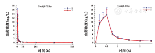 将Cmax、药时曲线下面积(AUC)0-t和AUC0-∞经对数转换后进行方差分析(ANOVA)。方差分析模型中顺序、药物、周期作为固定效应,受试者(顺序)作为随机效应。计算Cmax、AUC0-t、AUC0-∞几何均值比率(试验药/参比药)的90%置信区间,进行等效性比较,等效标准为80%~125%。同时进行双单侧t检验分析,进行等效性评价。