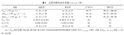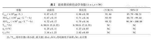 ±s,n=36)试验药与参比药,总紫杉醇的Cmax、AUC0-t及AUC0-∞几何均值比值的点估计和90%的置信区间分别为94.77%(89.21%~100.68%)、97.18%(92.57%~102.03%)和97.76%(93.24%~102.50%);游离紫杉醇的Cmax、AUC0-t及AUC0-∞几何均值比值的点估计和90%的置信区间分别为91.84%(85.79%~98.31%)、93.93%(88.73%~99.44%)和95.32%(90.06~100.88),均在80%~125%范围内,表明两种制剂为生物等效制剂。