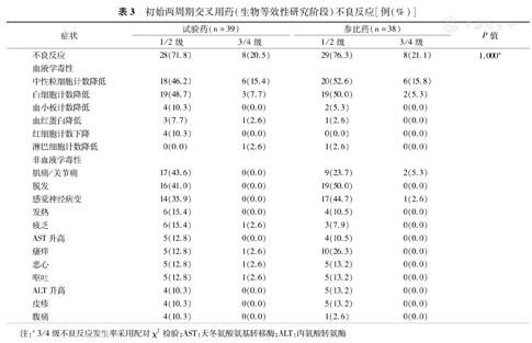 注:a 3/4级不良反应发生率采用配对χ2检验;AST:天冬氨酸氨基转移酶;ALT:丙氨酸转氨酶