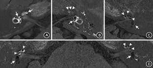注:A:前庭、耳蜗无/轻度积水;B:前庭、耳蜗中度积水;C:前庭、耳蜗重度积水;D:同一患者双侧前庭、耳蜗均重度积水;箭头示低信号区域为前庭内淋巴间隙,三角示低信号区域为耳蜗内淋巴间隙