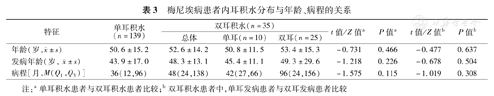 | 特征 | 单耳积水(n=139) | 双耳积水(n=35) | t值/Z值a | P值a | t值/Z值b | P值b | ||