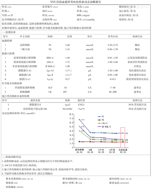 以文字形式对检测结果进行解释,应明确、简洁。必要时可以图和表的形式表达。与血脂异常疾病相关检测项目包括但不限于以下内容:(1)血脂检测:血脂是血清中的胆固醇、三酰甘油(TG)和类脂(如磷脂)等的总称,与临床密切相关的血脂主要是胆固醇和TG。(2)脂蛋白检测:脂蛋白分为乳糜微粒(CM)、极低密度脂蛋白(VLDL)、中间密度脂蛋白(IDL)、低密度脂蛋白(LDL)和高密度脂蛋白(HDL)。此外,还有一种脂蛋白称为脂蛋白(a)[Lp(a)]。与临床关系较为密切的脂蛋白检测项目有高密度脂蛋白胆固醇、非高密度脂蛋白胆固醇和低密度脂蛋白胆固醇等。低密度脂蛋白胆固醇可以通过采用Friedewald公式计算得出,或者直接采用低密度脂蛋白胆固醇试剂盒进行检测。每个检测实验室应该明确地在报告中指明低密度脂蛋白胆固醇的测定方法。(3)基因检测:包括家族性高脂血症基因突变检测、药物基因多态性检测等。