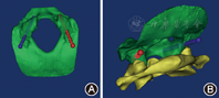Uribe等[1]和La Marca等[2]于2008年首次提出以枕骨髁作为单一颅侧固定点行枕颈内固定融合术的新观念。近来在解剖学适应性、生物力学稳定性、影像学和形态学以及尸体标本置钉的研究和该技术的成功案例报道均表明,枕骨髁螺钉固定技术在枕颈失稳上的可行性[1,2,4,11,12,13,14,15]。但枕骨髁位置独特且周边毗邻众多重要解剖结构,尤其是枕骨髁上方有舌下神经管通过[16],其内有舌下神经、咽升动脉脑膜支和舌下神经静脉丛等重要结构[17]。如何在置钉过程中有效避免舌下神经管的损伤显的尤为重要,Uribe等[1]通过对6具枕颈部标本置钉后认为,在枕骨髁矢状位平面,螺钉头倾角<5°可有效避免舌下神经管的损伤。Le等[5]提出头倾角应<10°,且尽可能与颅底平面平行,否则寰枕关节后缘及舌下神经管受侵犯的概率将会增加。王扬等[7]认为枕骨髁后部中点为进钉点配合3°头倾角置钉时成功率可达96.67%。但在实际手术操作过程中,术者肉眼及术中透视无法准确观测舌下神经管位置及颅底水平面方位,头倾角在实际置钉中缺乏良好的固定参照物,其大小难以得到准确预判,因此以头倾角指导置钉受到限制。