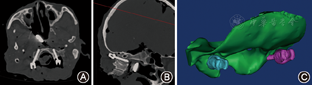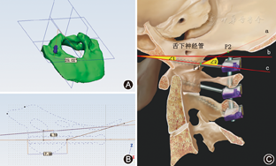 再次对所有置钉后标本行薄层CT扫描,观察螺钉方位,判断螺钉与舌下神经管、寰枕关节面的位置关系(图5A,图5B)。将所得术后CT数据导入Mimics 19.0软件,以术前模拟置钉相同方法重建相应骨性结构及螺钉(图5C),并对实际置钉参数进行测量,测量方法同模拟置钉参数测量。
