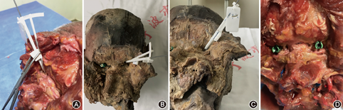 将标本固定于手术固定架,取标准后正中切口,逐层解剖分离,暴露枕外隆突至枢椎区域骨面(尽可能剃净皮质骨面的软组织),注意避免破坏正常骨性结构,显露枕骨髁后缘、寰椎后弓及椎动脉水平段。参照对应标本术前模拟置钉参数,以自制后路枕骨髁螺钉置钉工具,结合枕骨切线角、头倾角、进钉点,调节置钉工具角度及方位。一助手把持固定置钉器,保持置钉器处于预定位置,术者依次采用克氏针、开口锥及开路锥沿工具导向通道对枕骨髁制备钉道,探针确认钉道四壁完整。随后,沿预置钉道,置入直径3.5 mm枕骨髁螺钉,同方法操作对侧,手术过程未行术中X线透视(图4)。