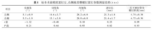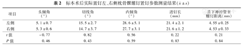 | 项目 | 头倾角(°) | 切线角(°) | 内倾角(°) | 进钉长(mm) | 舌下神经管至螺钉距离(mm) |