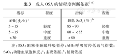 依据AHI,参考夜间最低动脉血氧饱和度(SaO2)分为轻、中、重度(表3)[16]。