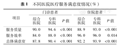 (1)不同类型医院满意度存在差异。调查发现专科医院患者满意度高于综合性医院(表1)。考虑医院服务规模对满意度的影响,因此不同医院的满意度计算为患者满意度评价占97%,规模指标占3%权重综合统计:即医院门诊(住院)满意度评分=患者满意度评分*97%+门诊(住院)规模指标*3%。(2)不同类型患者满意度存在差异。住院患者、门诊患者满意度分别为92.4、88.4,住院患者满意度较高。不同科室的门诊患者满意度存在差异(表2),其中满意度最高的科室为是精神科,最低的为全科。在访谈中,我们也发现不同类型患者的需求存在差异,门诊患者期待得到更多的医护人员的关注、沟通,对自己的病情也有更多了解;住院患者期望在医护人员响应及时性有所优化;内科患者多为慢性病、老年病患者期望得到更为细致的关注。
