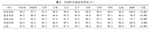 | 项目 | 中医科 | 肿瘤科 | 儿科 | 生殖 | 五官 | 妇产 | 内科 | 全科 | 外科 | 皮肤 | 精神 | P值 |