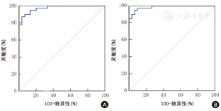 41例和19例CAH患者分别进行1日法和5日法中剂量DAST,睾酮平均抑制率为77.9%和91.3%(P<0.001),17OHP平均抑制率为95.2%和97.0% (P=0.220)。在进行1日法DAST的不同病因高雄激素血症女性患者中(CAH 41例,雄激素肿瘤10例,PCOS 20例),诊断CAH的最佳睾酮抑制率为61.2%(灵敏度87.8%,特异度96.7%);最佳17OHP抑制率为87.1%(灵敏度95.1%,特异度为93.3%)。