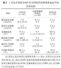 综上所述,1日法中剂量DAST作为CAH的功能学诊断试验,应用睾酮和17OHP抑制率来作为判断标准,灵敏度和特异度都能超过90%,是简便易行的功能试验。此外,本研究纳入的CAH患者包括经典型和非经典型,而临床实践中较难区分的是非经典型21OHD和PCOS患者,这些患者通常雄激素升高幅度有限,将来也需要进行更深入的研究来观察DAST中的其他肾上腺类固醇激素变化在女性高雄激素血症患者中的诊断价值,来更好地协助临床诊断和治疗。