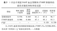 1日法中剂量DAST血总睾酮和17OHP抑制率的最佳灵敏度和特异度比较
