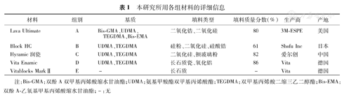 | 材料 | 组别 | 基质 | 填料类型 | 填料质量分数(%) | 生产商 | 产地 |