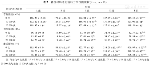 注:与老化0次比较,aP<0.05;与A组比较,bP<0.05;与B组比较,cP<0.05;与C组比较,dP<0.05;与D组比较,eP<0.05;老化20 000次与老化10 000次比较,均P>0.05