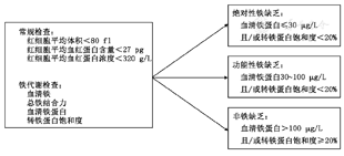 (1)小细胞低色素性贫血:男性Hb<120 g/L,女性Hb<110 g/L,红细胞形态呈低色素性表现;(2)有明确的缺铁病因和临床表现;(3)血清铁蛋白<14 μg/L;(4)血清铁<8.95 μmol/L,总铁结合力>64.44 μmol/L;(5)运铁蛋白饱和度<0.15;(6)骨髓铁染色显示骨髓小粒可染铁消失,铁粒幼细胞<15%;(7)红细胞游离原卟啉(FEP)>0.9 μmol/L(全血),血液锌原卟啉(ZEP)>0.9 μmol/L(全血),或FEP/Hb>4.5 μg/g Hb;(8)血清可溶性运铁蛋白受体(sTRF)浓度>26.5 nmol/L(2.25 mg/L);(9)铁治疗有效。
