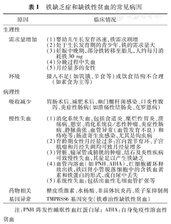ID/IDA的病因包括生理性及病理性两方面:生理性缺铁是由于需要增加及摄入不足;病理情况下的ID包括吸收不良、慢性失血等,部分慢性炎症通过上调铁调素导致铁吸收减少,从而引起ID/IDA。铁难治性IDA(IRIDA)是由于TMPRSS6基因突变导致铁调素水平升高,限制铁从吸收部位吸收及储存部位释放到血浆(表1)。