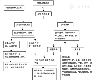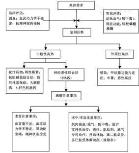 NMS是一种与使用抗精神病药相关的危及生命的代谢紊乱。与NMS相关的代表药包括氟哌啶醇和氟哌利多,但使用任何抗精神病药的患者均有风险。NMS在发病后有肌肉强直收缩,其临床表现也与MH非常相似,但两种疾病发病原因与机制完全不同。NMS有四大临床主征:肌强直、高热、植物神经功能紊乱及精神异常。表现为肌肉强直和横纹肌溶解症,中枢神经系统出现锥体外系征、意识改变和癫痫发作等。全身的症状包括体温过高(>38 ℃)、血压不稳、心动过速、呼吸急促和多汗。目前尚缺乏公认的NMS诊断标准,其诊断主要经鉴别诊断排除下列情况而定:(1)中枢性原因:其中包括药物反应(抗胆碱药物、两性霉素或化疗药物,五羟色胺撤退反应等)、创伤性脑损伤和致死性紧张症;(2)外周性原因:传染性疾病、甲状腺功能亢进、中暑和MH。对NMS有效的治疗药物包括溴隐亭(多巴胺激动剂)、丹曲林钠、苯二氮卓类药物和有助于改善强直患者通气的肌肉松弛剂。患者术后应转送重症监测病房继续支持性治疗,慎防肾功能衰竭。围手术期高热患者的鉴别诊断及麻醉注意事项见图1[5,14,15]。