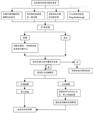 2.评估患者对MH的易感性:如前所述,有异常高代谢性的麻醉不良反应病史的患者、MH易感者一级亲属和患有先天性骨骼肌肉疾病的患者,是术中发生MH的高危患者。如果术前有不明原因的乳酸脱氢酶(LDH)或CPK显著升高,也应提高警惕,具体处理流程见图3。