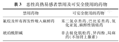 4.避免使用诱发MH的麻醉药物:对于可疑或确诊的MH易感者,区域麻醉是较好的选择。一般情况下,局部麻醉药物均可安全使用。如果必须实施全身麻醉,应避免使用表3中所列的禁用药物。