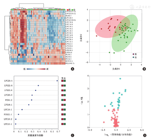 注:A.热图:每个小方格代表一种甘油磷脂,其颜色表示该种脂质的血清含量,含量越高色调越深(棕红色为高表达,蓝色为低表达)。每行表示每种甘油磷脂在不同样本中的血清水平,每列表示每个样本中所有甘油磷脂的血清水平;B.偏最小二乘-判别分析(PLS-DA)得分图:红点代表男性患者组,主要集中在得分图的左上角,表明这些样本中甘油磷脂的血清水平接近,绿点代表女性患者组,本图中红点与绿点间分布在不同区域,代表两组患者的血清甘油磷脂水平差异较大;C. PLS-DA载荷图:横坐标是变量重要性投影(VIP),用于估计每个参数在偏最小二乘判别模型中的重要性,纵坐标显示对性别分组起主要贡献的代谢产物。男女相对水平以不同颜色表示,红色代表血清中甘油磷酸酯高表达,绿色代表低表达。D.火山图:绿色代表不同性别分组间有显著差异的甘油磷脂(P<0.05,且变化倍数>1.2或<0.8),粉色代表无显著差异的甘油磷脂。横坐标为某一磷脂在女性患者与男性患者中的比值取以2为底数的对数,纵坐标表示该磷脂在不同性别分组中P值取以10为底数的对数,并取负值。该图中显著变化的磷脂为LPC20:4、LPS22:6、LPS20:4、LPC20:3、PE 36:2、LPS18:1、LPC 18:1、LPC(O22:1)、LPC 18:2、LPC 16:1、LPC22:6、LPC(O24:1)、LPC18:3、LPC(O20:0)、PCP32:1、LPE18:0、LPC18:0、PE40:5、LPC 14:0、LPI 16:0、PE(O40:7)、LPC 16:0、LPC 20:5