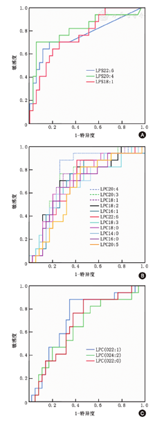注:A、B、C分别为LPS、LPC、LPC(O)的ROC曲线。LPS:溶血磷脂酰丝氨酸;LPC:溶血磷脂酰胆碱;LPC(O):溶血烷基磷脂酰胆碱