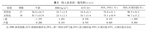 51例患者中,男17例,女34例,年龄(43.3±14.0)岁;FEV1%预计值(92.3±16.0)%,FEV1/FVC (73.3±10.8)%;不同性别组年龄、体质指数、FEV1%预计值及FEV1/FVC差异均无统计学意义(均P<0.05)(表2)。