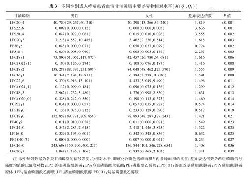 用代谢组学分析不同性别成人支气管哮喘(简称哮喘)患者血清甘油磷脂的差异。