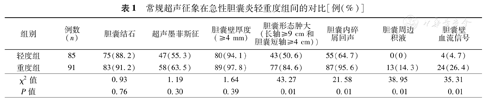 常规超声征象在急性胆囊炎轻重度组间的对比[例(%)]