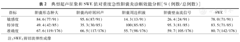 典型超声征象和SWE值对重度急性胆囊炎诊断效能分析[%(例数/总例数)]