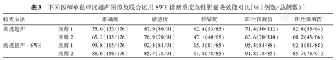 不同医师单独审读超声图像及联合运用SWE诊断重度急性胆囊炎效能对比[%(例数/总例数)]