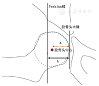患儿取平卧位,手术均在全身麻醉下进行,常规消毒铺单后,首先经双大腿近端内侧内收肌表面横行切口(3 cm)行双侧内收肌患侧髂腰肌腱松解,双侧内收肌松解可有效改善髋关节外展角度,增加安全角,增加复位的稳定性及安全性,内收肌髂腰肌腱松解后试行闭合复位,记录安全角(安全角为患侧髋关节从屈髋90°最大外展角度逐渐内收到达脱位之间的夹角,所有患者均由同一名高年资医生测量)、股骨头内侧化率[7](标准双髋正位造影平片,测量方法见图1,所有患者均由同一名高年资医师测量),并观察是否中心复位。