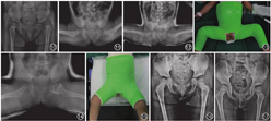 患者人类位石膏外固定6~8周后改用进一步减小外展角度的膝上双髋人类位石膏固定2~3个月。更换二期石膏时均常规造影拍双髋平片测量股骨头内侧化率,术前及末次随访拍片观察有无股骨头缺血性坏死(AVN)及测量髋臼指数(图14,图15,图16,图17)。