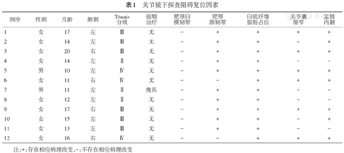随访时间平均26个月(18~36个月),全部12髋在关节镜下复位成功。至末次随访时,12髋均无疼痛及活动受限,步态正常,肢体无短缩,Trendelenburg征阴性。患儿一般情况及关节镜下探查阻碍复位因素见表1。安全角由术前的18.5°±3.8°,增加到术后的61.9°±6.5°,差异有统计学意义(t=-28.944,P<0.01)。股骨头内侧化率由术前的62%±20%,增至镜下清理后的104%±16%,差异有统计学意义(t=-3.519,P<0.05)。髋臼角由术前的40.6°±5.0°,降至术后的29.4°±5.0°,差异有统计学意义(t=5.463,P<0.01)。