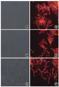 诱导组细胞形态规则,排列规整;而加药组细胞形态杂乱无章,出现了细小的伪足,呈扁平伸展样。细胞F-actin染色显示,诱导组和空白加药组细胞骨架饱满,排列整齐均匀;而加药组细胞骨架变得稀疏,呈长梭形并伴有伪足(图2)。