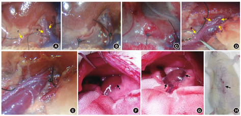注:A.暴露右侧肾门(a.右肾动脉,b.右肾静脉,c.右输尿管);B.结扎右肾动、静脉和右输尿管;C.切除右肾;D.分离暴露左肾动脉分支(a.左肾后段动脉,b.左肾上段动脉,c.左肾前段动脉,d.左肾下段动脉。左肾动脉分支常有变异);E.结扎左肾动脉部分分支,保留约1/3左肾血供,实现5/6肾切除术的效果;F.左肾动脉分支结扎前左肾(箭头所示);G.左肾动脉分支结扎后左肾(箭头示左肾两极梗死后充血呈暗红色);H.腹部切口(箭头所示)