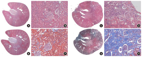 注:A(HE ×12.5)、B(HE ×200). Sham组见肾小球、肾小管及肾间质形态正常;C(HE ×12.5)、D(HE ×200). STNx组见肾小球硬化;E(Masson ×12.5)、F(Masson ×200). Sham组见肾脏纤维组织分布正常;G(Masson ×12.5)、H(Masson ×200). STNx组见肾小球、肾小管及肾间质严重纤维化