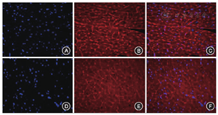 注:A. Sham组心肌细胞核染色(DAPI ×400);B. Sham组心肌细胞膜染色(WGA ×400);C. A和B重叠图像;D. STNx组心肌细胞核染色(DAPI ×400);E. STNx组心肌细胞膜染色(WGA ×400);F. D和E重叠图像