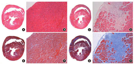 注:A(HE ×12.5)、B(HE ×200). Sham组见心肌组织正常;C(HE ×12.5)、D(HE ×200). STNx组部分心肌组织坏死、纤维化;E(Masson × 12.5)、F(Masson ×200). Sham组心肌纤维组织分布正常;G(Masson ×12.5)、H(Masson ×200). STNx组局部心肌组织严重纤维化