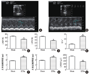 术后12周,心脏超声结果提示,与Sham组比较,STNx组左室室壁增厚,心室容积减少,舒张功能下降,同时合并收缩功能下降。STNx组LVEF为(51.55±1.30)%,Sham组为(68.25±1.80)%,STNx组低于Sham组(t=23.78,P<0.001);STNx组LVFS为(27.65±0.98)%,Sham组为(41.82±1.58)%,STNx组低于Sham组(t=24.10,P<0.001);STNx组E/e′为12.66±0.84,Sham组为4.61±0.58,STNx组高于Sham组(t=24.94,P<0.001);STNx组LVAW厚度为(2.47±0.09)mm,Sham组为(1.73±0.04)mm,STNx组高于Sham组(t=23.76,P<0.001);STNx组LVPW厚度为(2.45±0.10)mm,Sham组为(1.81±0.05)mm,STNx组高于Sham组(t=18.10,P<0.001);STNx组LVEDV为(131.83±6.43)μl,Sham组为(219.35±10.97)μl,STNx组低于Sham组(t=21.77,P<0.001)(图6)。