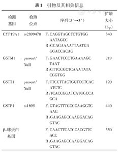 (1)主要试剂耗材及仪器:血液DNA提取试剂盒(货号DP318,北京天根生化公司)、Plantinum PCR Master Mix(货号KT204,北京天根生化公司)、D2000 DNA marker(货号MD114,北京天根生化公司)、D15000 DNA marker(货号BM012-01:EarthOx)、限制性内切酶FastDigest MspⅠ(货号FD0544,立陶宛Fermentas公司)、限制性内切酶RasⅠ(货号R6371,Promega公司)、NanoDrop2000超微量分光光度计、凝胶成像仪。引物由上海生工生物工程有限公司代为合成,纯度为PAGE级。检测的基因,检测的位点,引物序列及扩增片段大小见表1。(2)方法:采集入组者血液2 ml,并将其保存在-20 ℃冰箱。提取血液DNA后,采用多重等位基因特异聚合酶链式反应(MAS-PCR)方法检测GSTM1和GSTT1基因多态性。使用相应引物对不同基因片段进行PCR扩增,扩增产物通过浓度为2%琼脂糖凝胶进行电泳检测,并判断是否符合预期片段大小。对经琼脂糖电泳检测合格的GSTM1、GSTT1的PCR产物,进行MspⅠ酶切,酶切程序为:37 ℃,60 min;70 ℃,5 min;4 ℃,30 min。采用限制性片段长度多态性聚合酶链反应(RFLP-PCR)方法检测CYP19A1 rs2899470和GSTP1 rs1695基因多态性。对经琼脂糖电泳检测合格的CYP19A1基因PCR产物,进行RasⅠ酶切,酶切程序为:37 ℃,60 min;70 ℃,5 min;4 ℃,30 min。在120 V电压下电泳30 min后在紫外凝胶成像中成像,并记录结果。