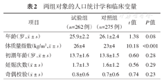 两组对象的人口统计学和临床变量见表2所示。两组年龄(t=1.38,P=0.08)、初潮年龄(t=0.60,P=0.28)、妊娠(t=0.56,P=0.29)和奇偶校验(t=0.74,P=0.23)均差异无统计学意义。