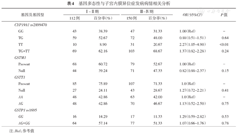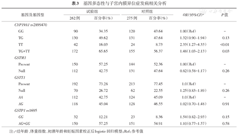EM成因复杂,既有环境因素的作用,又有遗传变异。EM的发生与特定基因位点出现多态性,引起人体对环境毒素物质代谢异常有关。CYP19A1是芳香化酶P450 19A1的编码基因,也是有代表性的Ⅰ相代谢酶,在雌激素合成过程中,芳香化酶(Cytochrome,P450 family)是关键限速酶之一,把C19类固醇转化成雌激素的合成酶。在正常子宫内膜,芳香化酶呈低表达或不表达,而在异位内膜及在位内膜腺体和间质细胞胞质内呈高表达状态,且异位内膜表达高于在位内膜,雌激素合成过程的芳香化酶在EM呈活跃状态,可能参与疾病的发生和发展[4]。GST是一种普遍存在各种物种和细胞内的Ⅱ相代谢酶,并参与多种细胞功能的蛋白,作为与炎症相关的蛋白,内膜异位的组织中其表达水平比正常组织要低得多[5]。目前已经证明基因的多态性与各种各样的疾病有关系,基因多态性的产生根源是基因水平上的变异,这种变异将通过各种不同的机制影响细胞内的生化过程。CYP 19A1和GST基因的多态性也可能对EM的病发及疾病的进程产生影响。