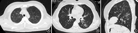 注:A:双肺小结节影和磨玻璃影(CT平扫);B:左肺下叶磨玻璃样改变(高分辨率CT);C:左肺磨玻璃样改变和支气管壁增厚、支气管扩张(高分辨率CT)